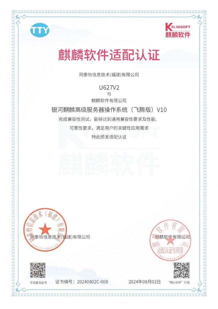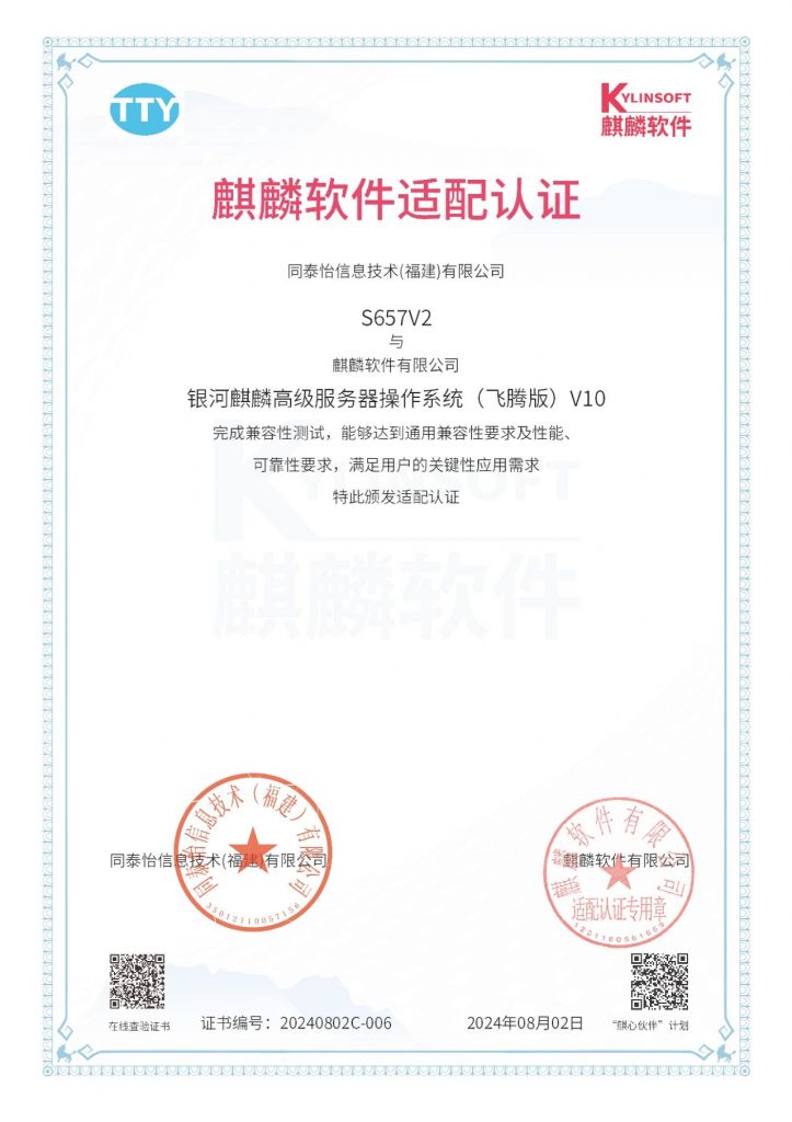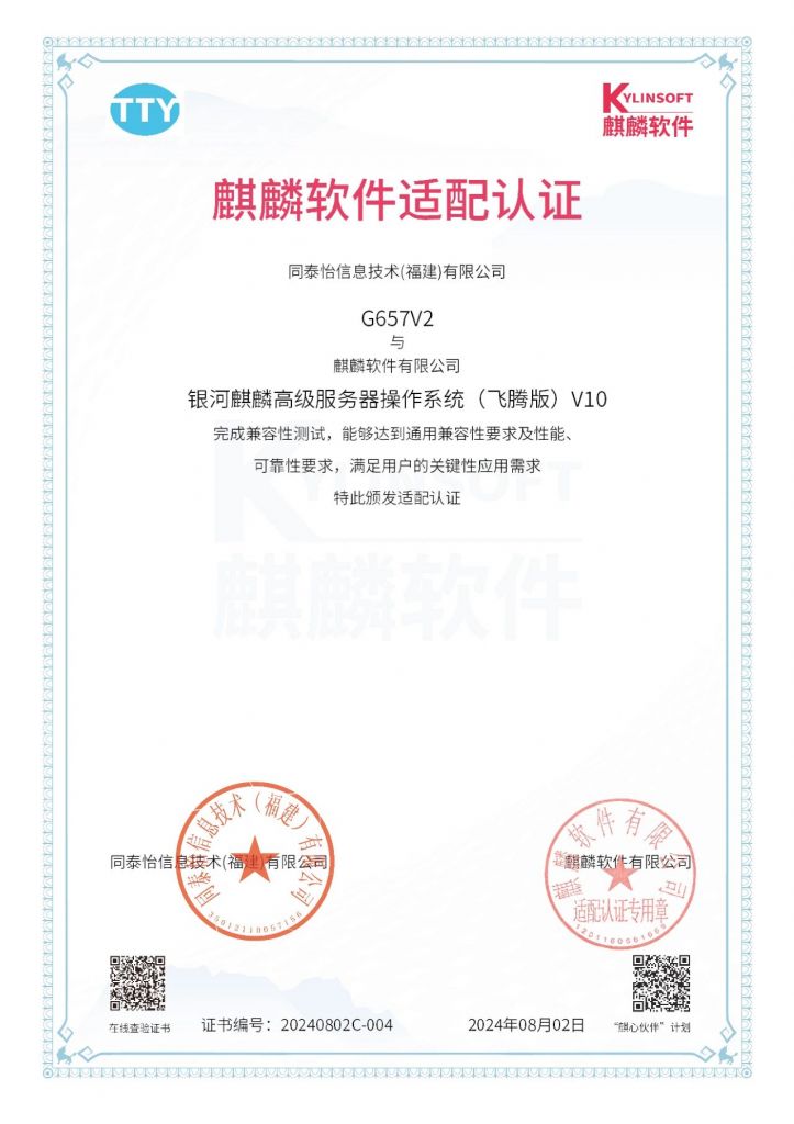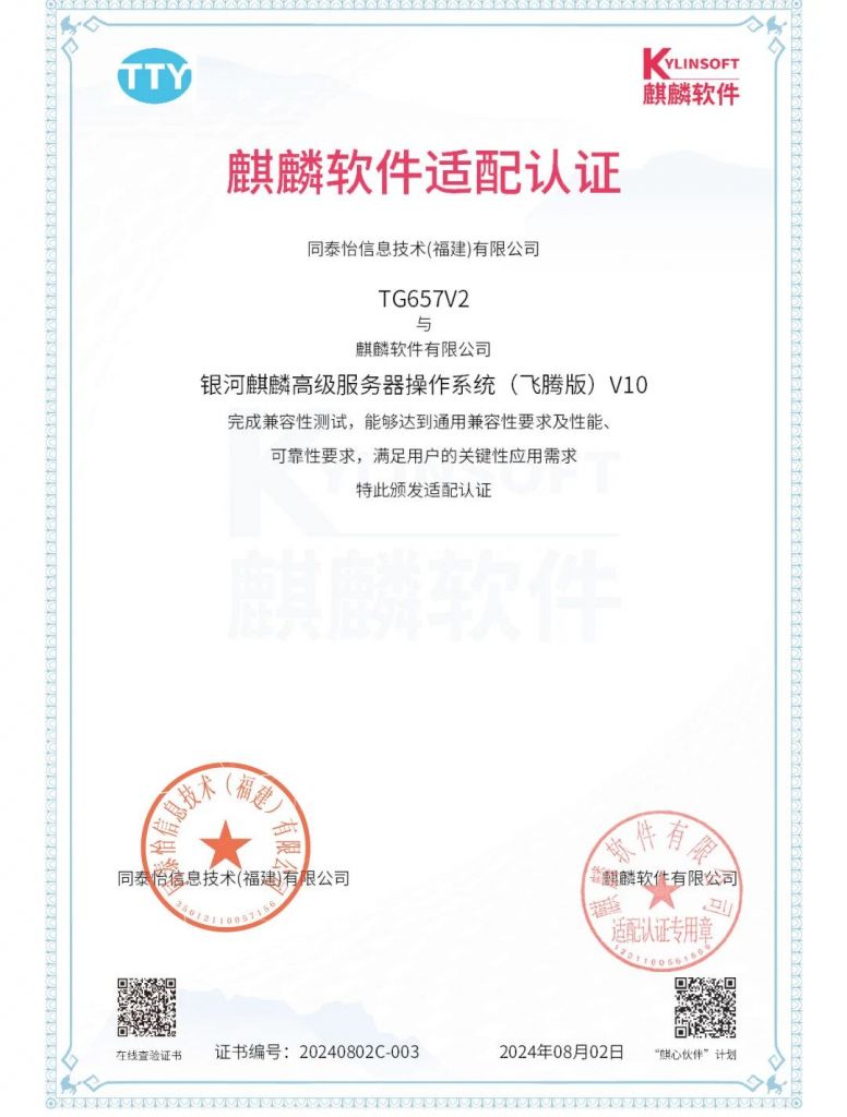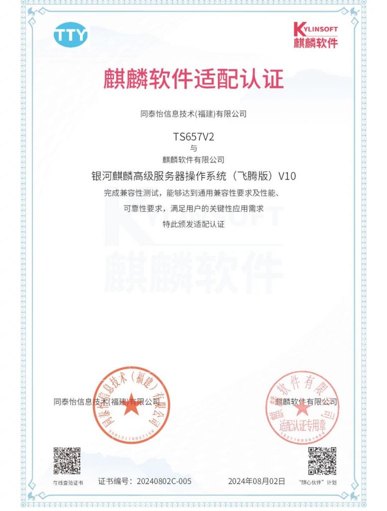 近日,同泰怡與麒麟軟件完成產(chǎn)品兼容互認(rèn)證測(cè)試。測(cè)試結(jié)果表明:同泰怡TG657V2,TU627V2,TS657V2與銀河麒麟高級(jí)服務(wù)器操作系統(tǒng)(飛騰版)V10完成兼容性測(cè)試,能夠達(dá)到通用兼容性要求及性能、可靠性要求,滿足用戶的關(guān)鍵性應(yīng)用需求,系統(tǒng)功能運(yùn)行穩(wěn)定。
