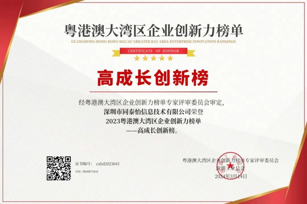 近日,在第四屆深圳企業(yè)創(chuàng)新促進(jìn)大會(huì)暨深圳工業(yè)總會(huì)2023年度年會(huì)上,重磅發(fā)布“2023粵港澳大灣區(qū)企業(yè)創(chuàng)新力榜單”,表彰了一批創(chuàng)新實(shí)力強(qiáng)發(fā)展質(zhì)量高的優(yōu)質(zhì)企業(yè)。同泰怡長(zhǎng)期堅(jiān)持技術(shù)自主創(chuàng)新,創(chuàng)新成果獲得高度認(rèn)可,入選“高成長(zhǎng)創(chuàng)新榜”。